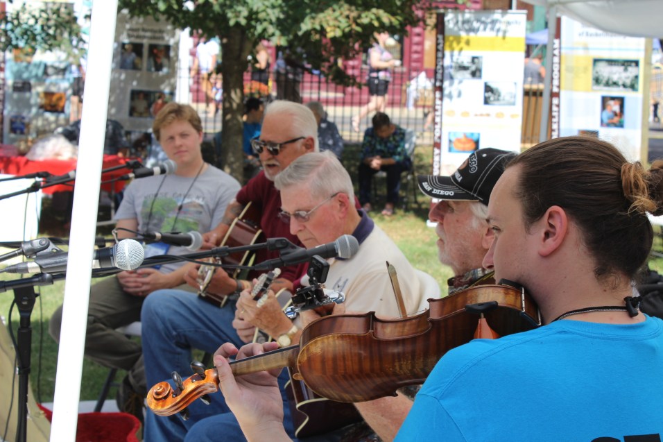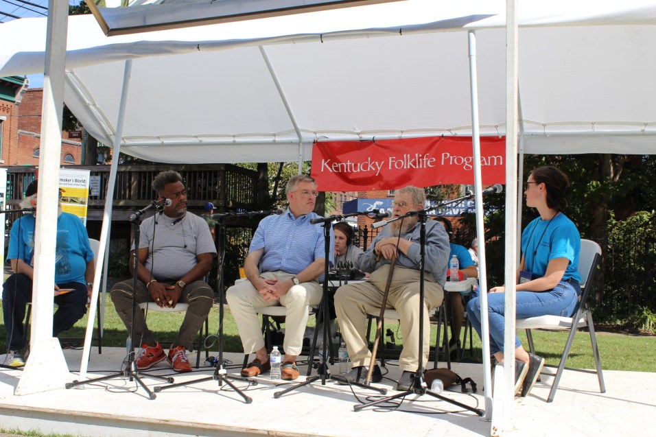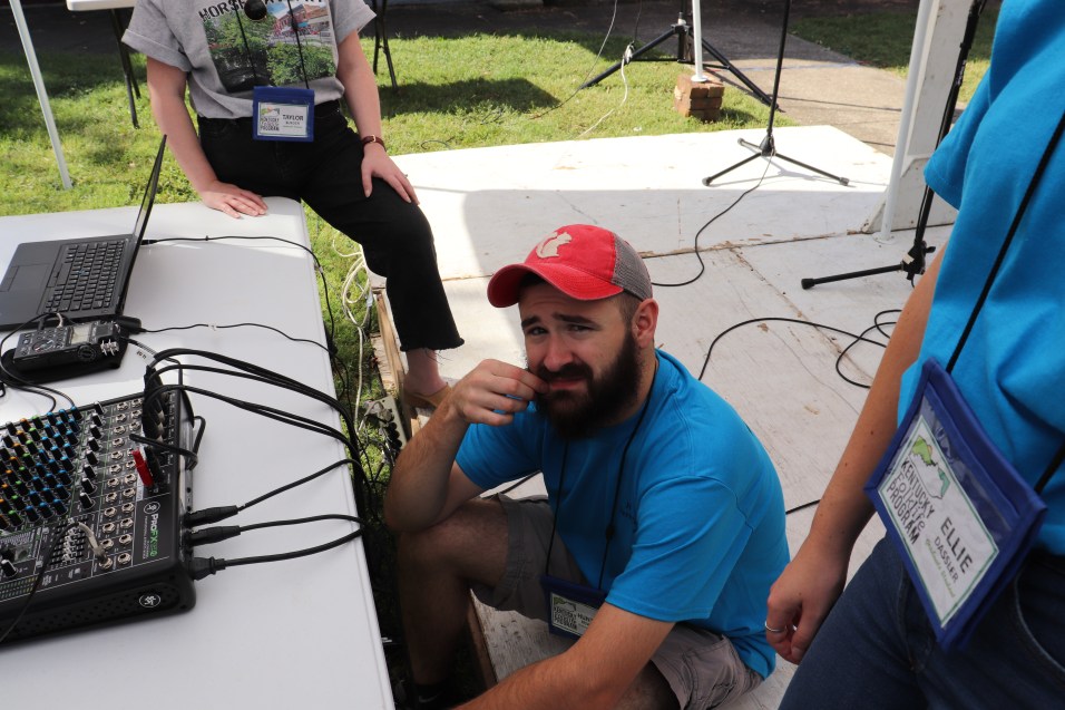 On Saturday, September 21st, graduate students, faculty, and staff in the WKU Folk Studies Program and Kentucky Folklife Program partnered to produce the Chattin’ on the Porch stage at the Horse Cave Heritage Festival in Horse Cave, Kentucky. A yearly tradition, this event serves as a key opportunity for Folk Studies students to gain fieldwork and festival production skills. Under the guidance of Kentucky Folklife Program staff and Folk Studies faculty, students take the lead in presenting the event: students interview local tradition-bearers from Horse Cave and Hart County live on stage, document the stage with professional video and audio recording equipment, and learn how to set-up the stage’s sound system (from the mixer to the microphones). It is a wonderful excuse to get out and connect with the communities that surround Bowling Green and Western Kentucky University.