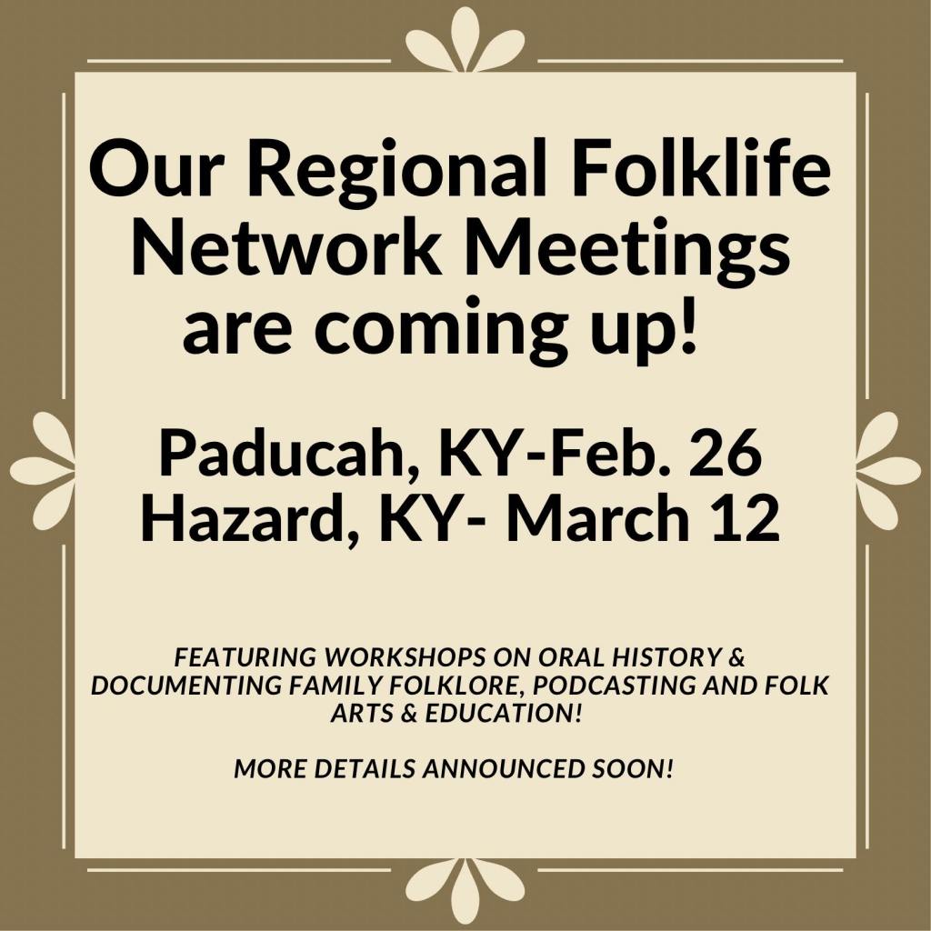 Our Regional Folklife Network Meeting in Paducah, KY will be on February 26 and our meeting in Hazard, KY will be on March 12 (all dates in 2022, of course)! We are excited to work with our neighbors in the Eastern and Western parts of Kentucky to host workshops on Oral History & Collecting Family Folklore, Podcasting and Folk Arts & Education. More details coming soon, so stay tuned!