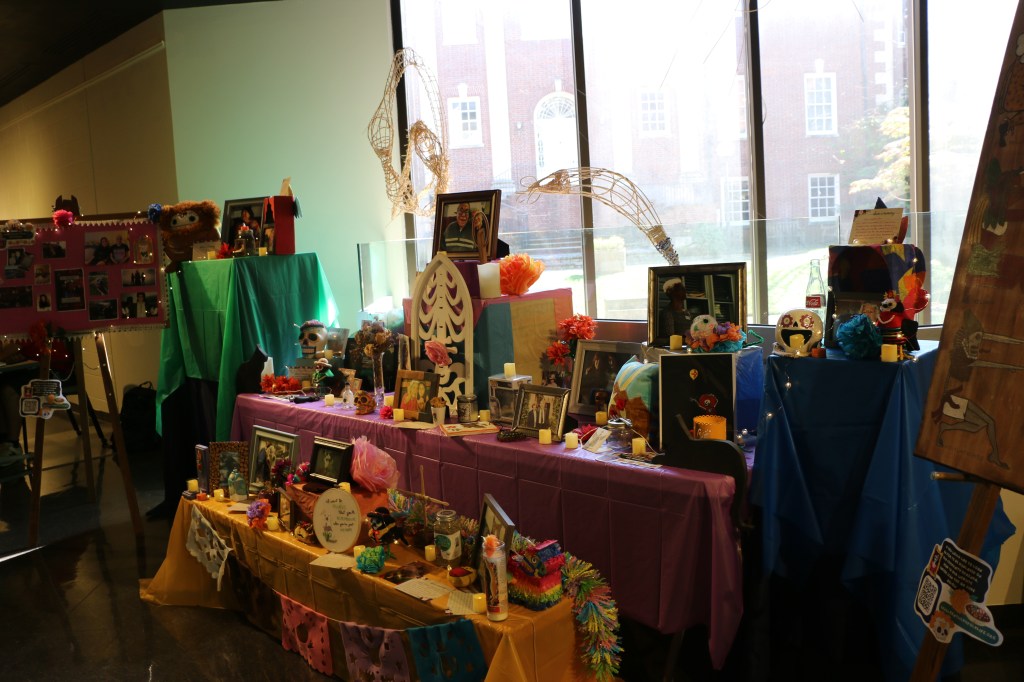 A photo of a miniature ofrenda alongside various offerings during the 2023 installation of the KFP Community Ofrenda; photo taken by Camille Maria Acosta