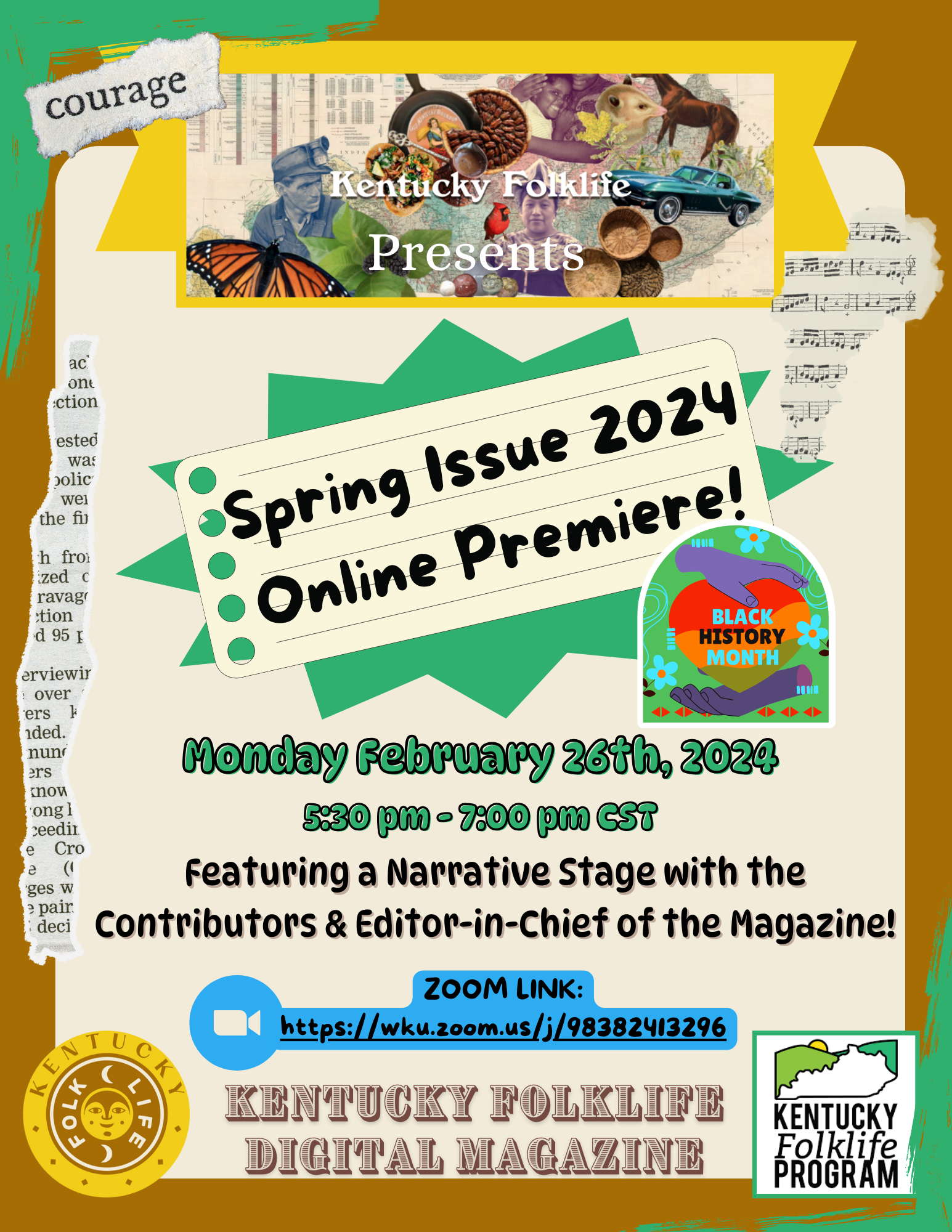 On Monday, February 26th, at 5:30 pm the Kentucky Folklife Program (KFP), in the WKU Department of Folk Studies and Anthropology, hosted an online premiere of the Spring 2024 issue of its digital magazine, Kentucky Folklife. This eighth issue highlights a variety of work exploring folklore and ethnographic projects centering on the African-American experiences in Kentucky.
