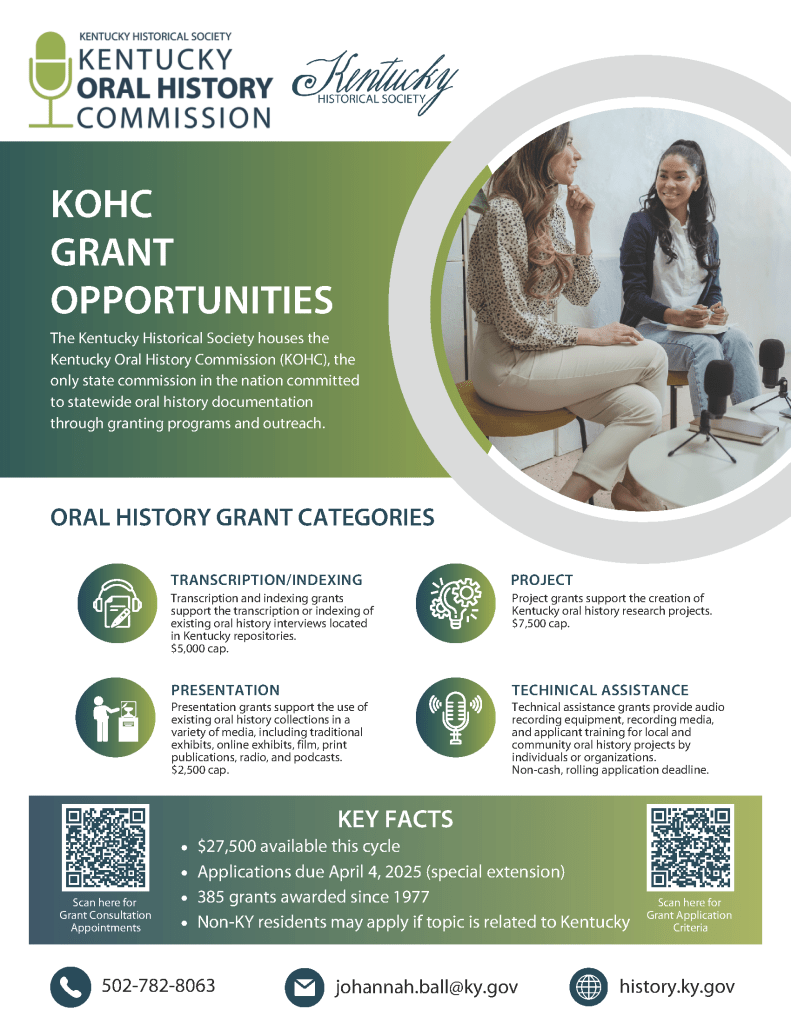 Twice per year, the Kentucky Oral History Commission grant programs offer monetary, equipment, and training grants to assist amateur or professional oral historians with oral history research projects on topics of particular significance to Kentucky. These grants encourage statewide participation in the collection and preservation of historically valuable interviews. Project grant application deadlines for FY2025 are October 4, 2024, and April 4, 2025.