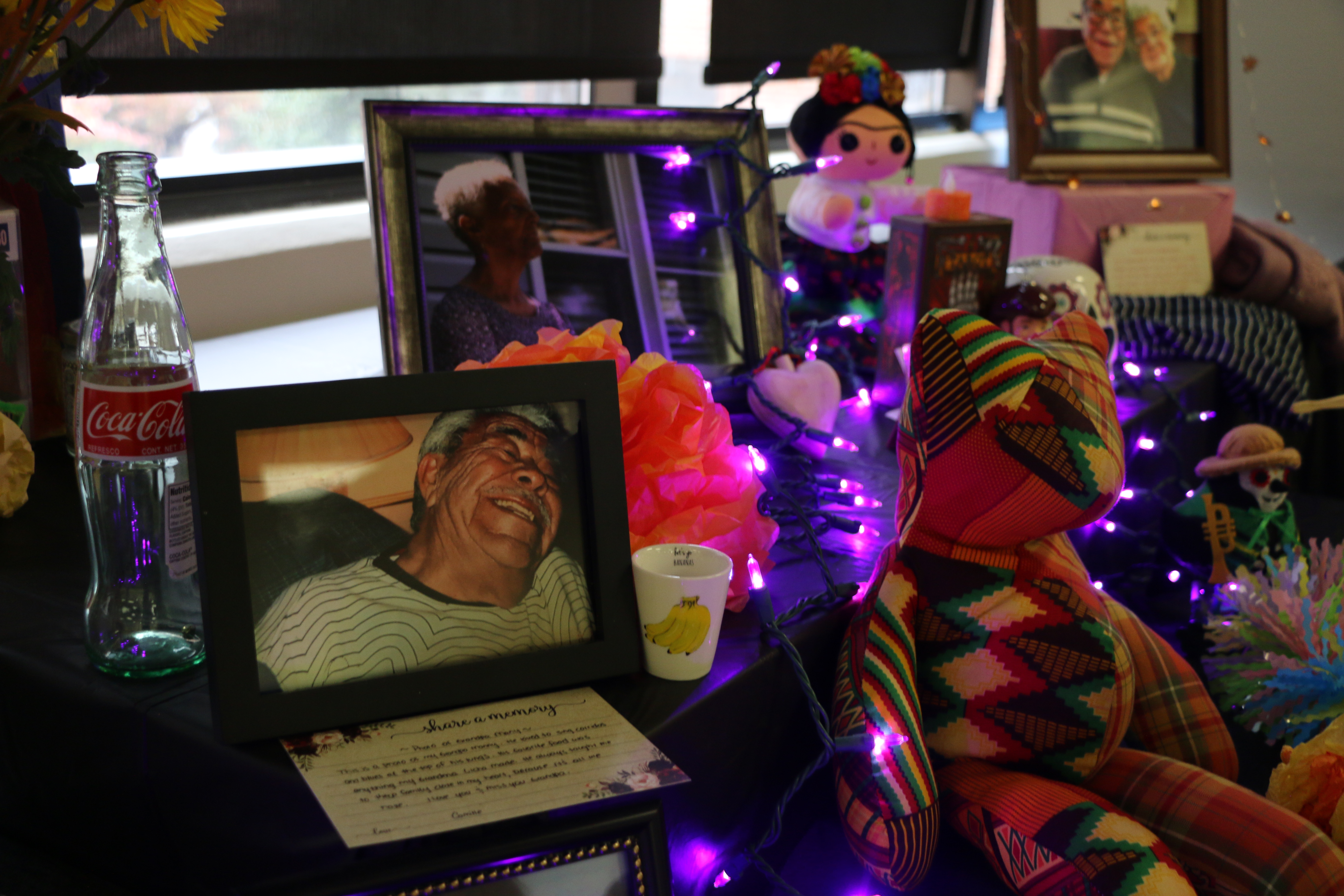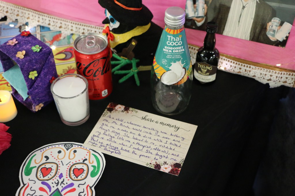 A candle, Coke Zero can, and Thai Coco bottle are placed on the ofrenda to commemorate Campbell Lahman’s loved ones; PC: Camille Maria Acosta