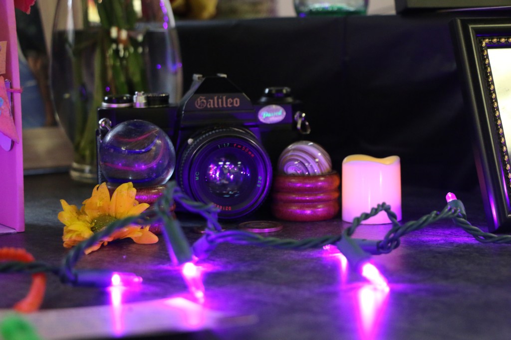 First Photo: A camera, marbles, and pesos loaned by Ryan Black & Joe Wilson; Second Photo: A dandelion yellow pot and a framed photo of Ryan’s Grandmother loaned by Ryan Black; PC: Camille Maria Acosta