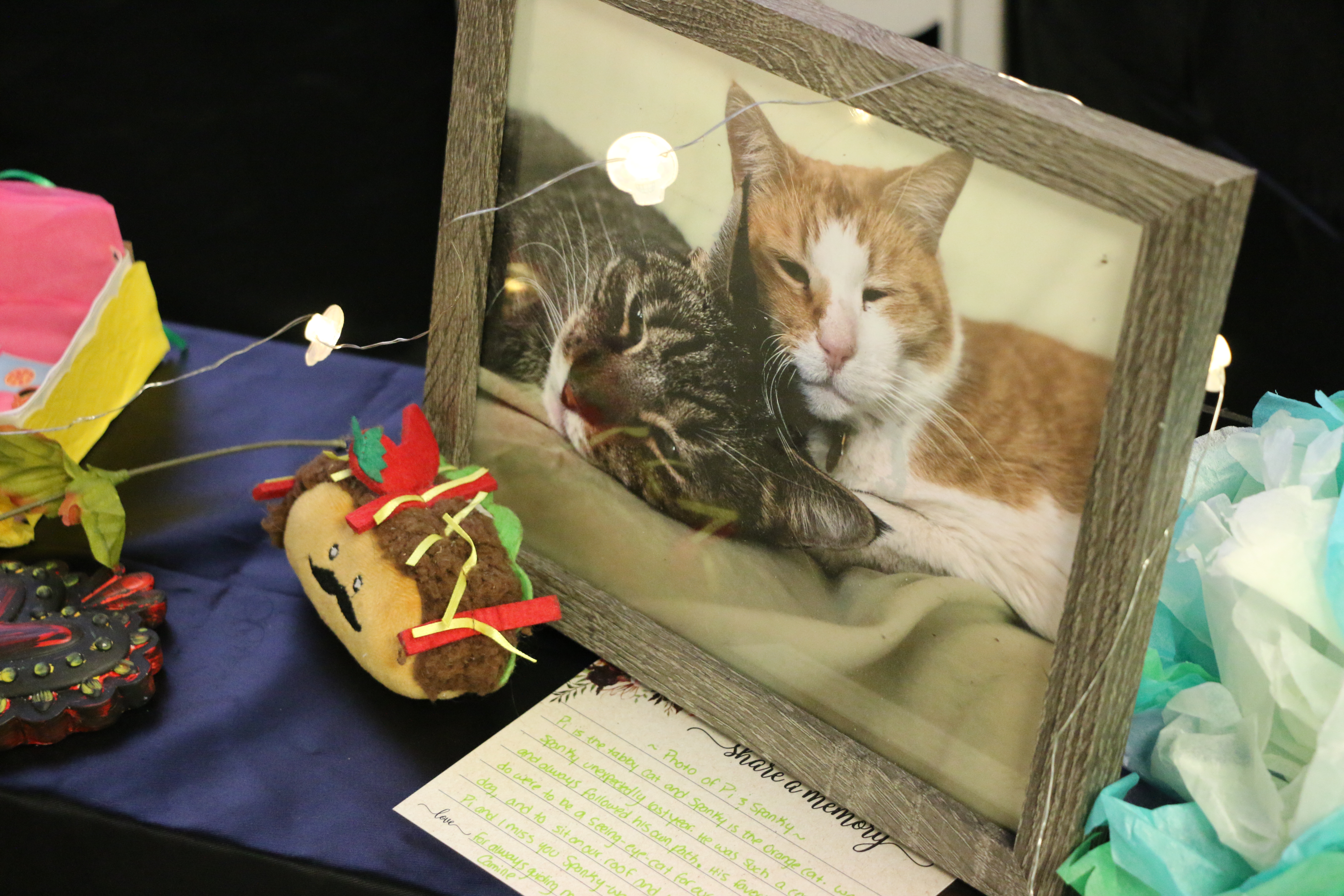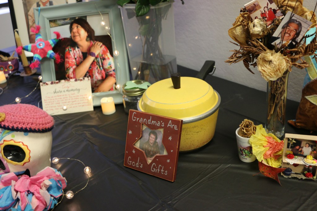 Hosted at the Kentucky Museum on WKU’s campus, this year’s altar was the biggest display yet, with participation from across the United States. It was stunning to see the unique nature in which individuals, across state borders and across cultural backgrounds, could come together to bring the stories of their loved ones to light. Seeing photos of smiling faces, signature sweaters, cat toys, and folk art illuminated by LED candles and string lights felt magical; felt hopeful. Ryan Black, AV Support Specialist at WKU has been loaning items to the Community Ofrenda for the past two years. We shared smiles and lovely memories in front of the ofrenda of Ryan’s grandmother, as he placed her well-loved, dandelion yellow cooking pot next to her framed photo. Ryan mentioned, “[The ofrenda] taught me that even though we may have different backgrounds and cultures we truly are connected at a fundamental level, and that’s something important to remember…Traditions and rituals like the ofrenda create a sense of identity and purpose, something that can connect us through the years. Even if they change with the times and the people who celebrate them, their core is still there, and that’s something very important.”