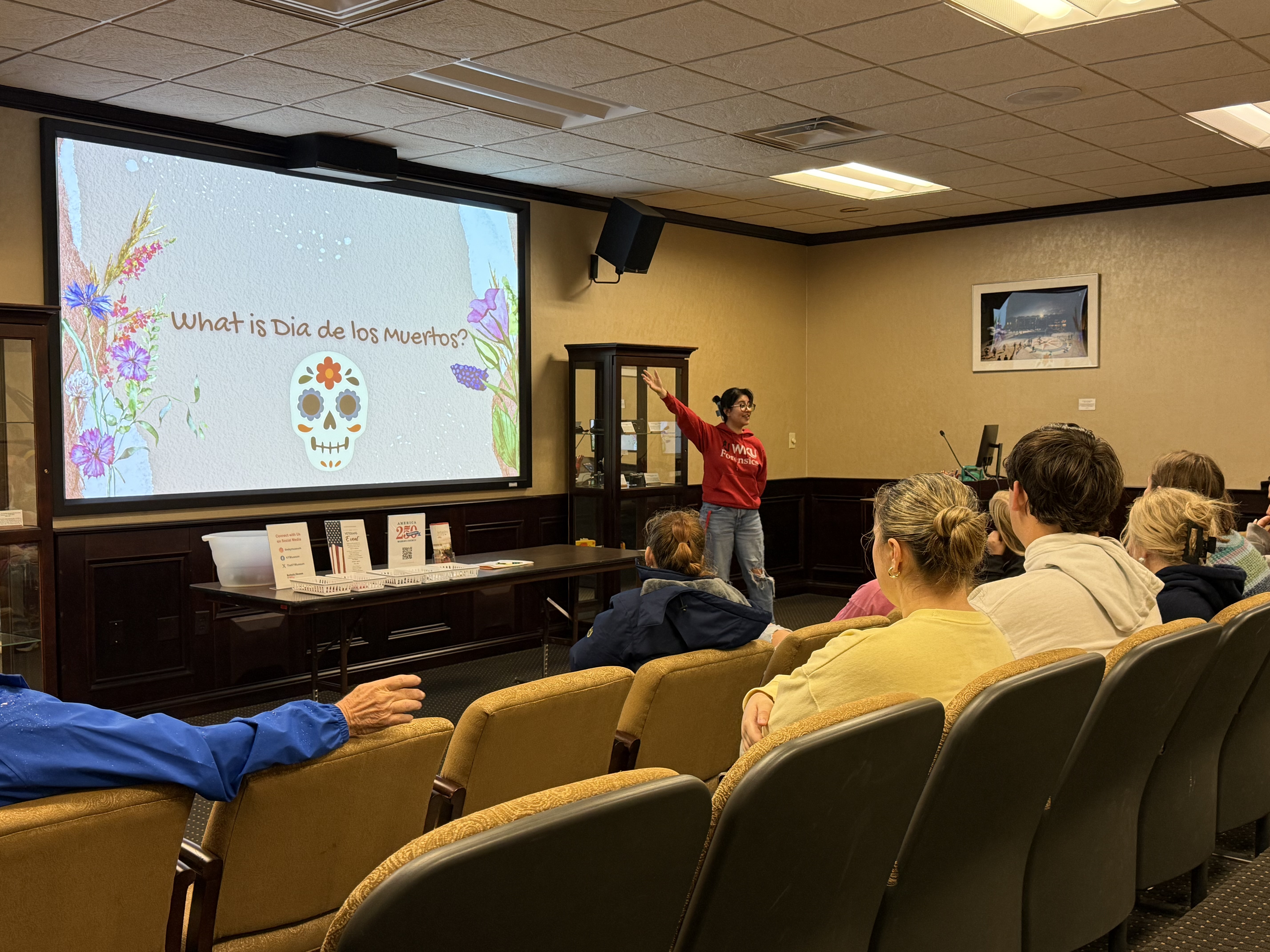 In 2023, the Kentucky Folklife Program (KFP) crafted their first installation of the Día de los Muertos Community Ofrenda, giving the Bowling Green public the option to participate. Camille Maria Acosta, Folklife Specialist with the KFP spearheaded this tradition, and has made it a point to continue this custom every year since. “What was once born from a moment of homesickness,” Acosta states, “has since become a safe space for the Bowling Green community to talk about the pain, sadness, happiness, joy, and complex emotions that comes with grieving someone you loved so deeply. This ofrenda has now become a home for us all.” Typically, those celebrating Día de los Muertos will craft their own versions of an ofrenda or altar inside of their living spaces, whether that be their living room or their kitchen table. However, the KFP’s public display of a traditional ofrenda, has given the WKU community the chance to share grief in a communal space.