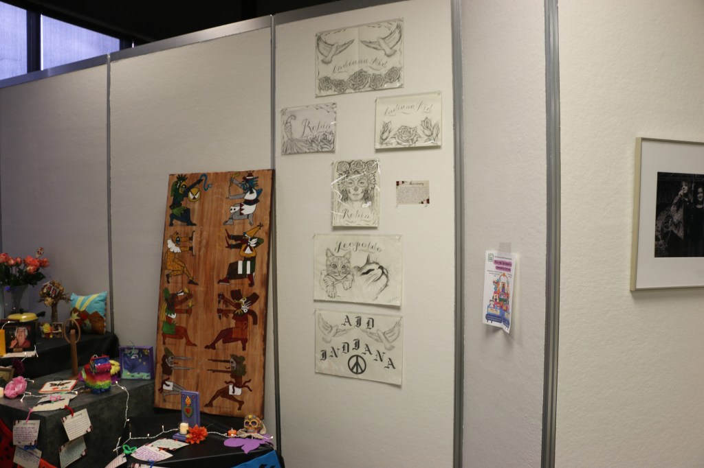 This year, many community members also took the time to use their items of commemoration as a medium for advocacy. Dr. Robin Valenzuela, Assistant Professor of Anthropology at WKU is also the co-founder of Indiana AID (Assistance to Immigrants in Detention). According to their website, “Indiana AID is a volunteer group that supports individuals detained by ICE in Indiana by bearing witness to their experiences through visits, offering information, and providing resources to them and their families.” Dr. Valenzuela’s offerings for this year’s ofrenda display included breathtaking hand drawn art pieces from individuals detained in Indiana. It is important to note that each of these drawings were created with the sole use of a golf pencil, for that was the only artistic item allowed in this detention center. When asked about the meaning behind these loaned art pieces, Dr. Valenzuela continued, “The ofrenda provides a wonderful opportunity to call attention to those who have been separated from their families and disappeared into the immigration detention system. It provides an opportunity to show their humanity and their resilience in the face of social death…It’s important for us to recognize the impact that other people have had on our lives and the deep emotions that come with loss. Recognizing this publicly helps us build supportive relationships across our community.”
