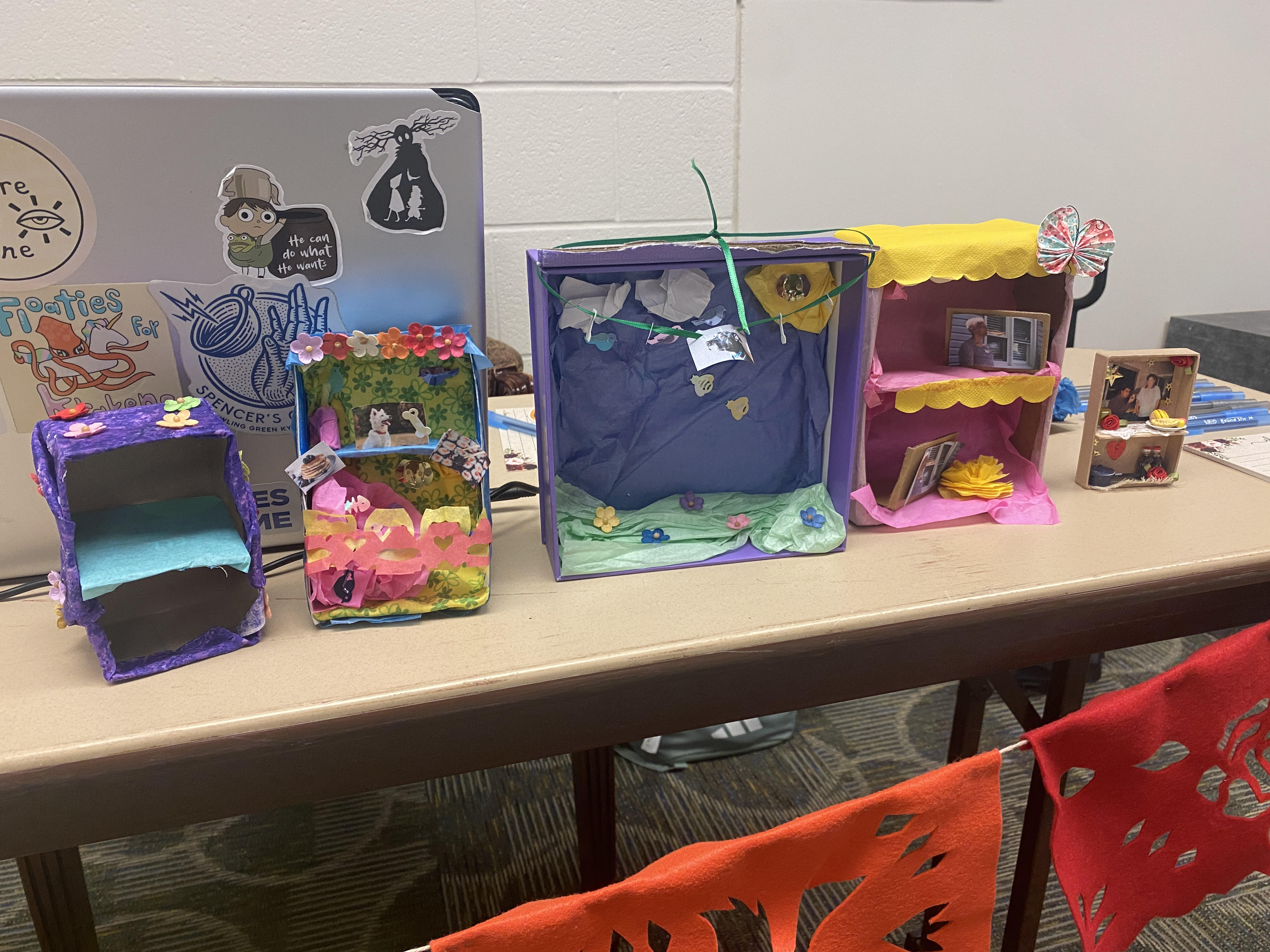 An exciting intersection of this Día de los Muertos exhibit is the chance to collaborate with K-12 schools and university classes. From South Green Elementary in Glasgow, Kentucky to WKU’s Intro to Folklore Class, weaving together this cultural holiday with student curriculum was enlightening. Throughout the run of this ofrenda, students of all ages across Kentucky visited the altar to learn about Mexican folklore and traditions, asked questions about grieving customs, and even made mini ofrendas of their own. John Yakel, Instructor for WKU’s Art Education program hosted his Art 310 Elementary Education students at the Kentucky Museum for an afternoon of folk art exploration and craftmaking. Students used recycled materials such as cardboard boxes, string, and tissue paper to make tiny “take home” versions of Dia de los Muertos altars. The hope for classes like these, is to incorporate cultural activities and folk art lectures into future elementary school curriculum. When asked about the impact of this exhibit on his students, John responded, “Making ofrendas and celebrating Día de los Muertos reminds us that we are living the hopes and dreams that our ancestors wished for us. They are traveling with us in our DNA, and in our hearts and minds. It is my hope that we make them proud of all we have become.”